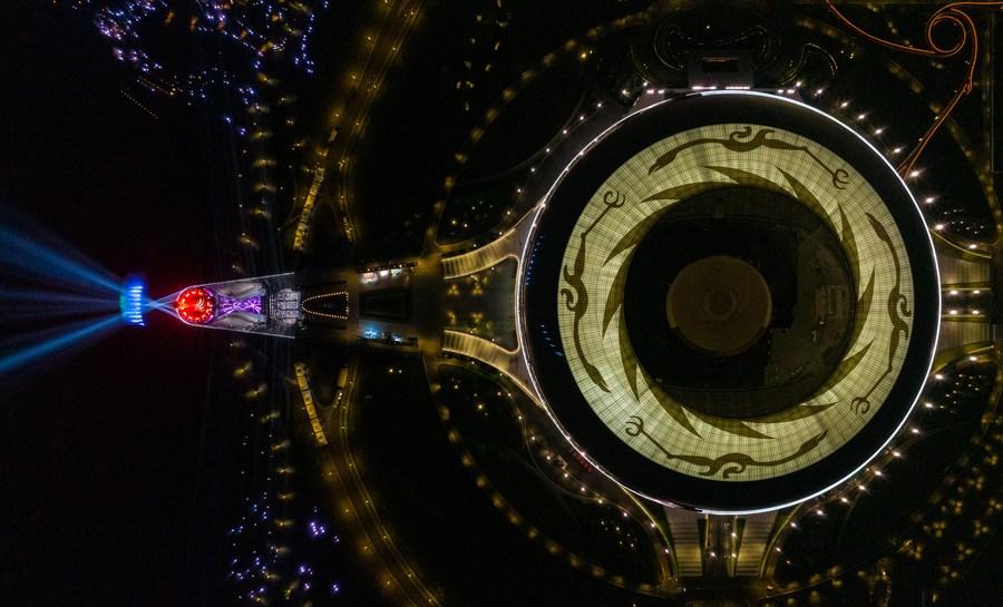 Aerial photo taken on April 19, 2023 shows the stadium for the opening ceremony and cauldron in the light show for 100-day countdown to the 31st FISU World University Games at Dong'an Lake Sports Park in Chengdu, southwest China's Sichuan Province. (Xinhua/Shen Bohan)