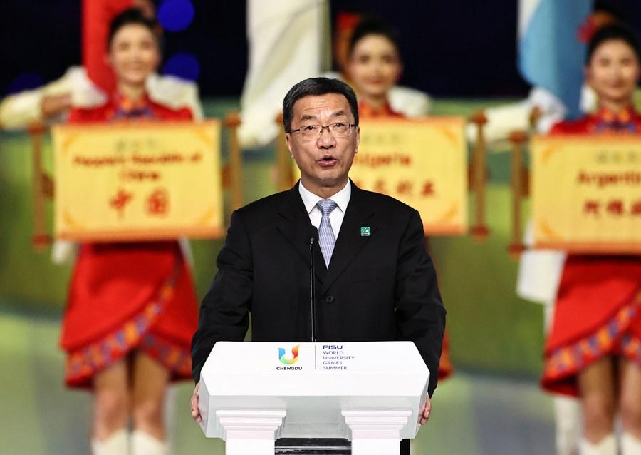 Huai Jinpeng, president of the Organizing Committee of the Chengdu Universiade, delivers his speech during the opening ceremony. (Xinhua/Yang Qing)