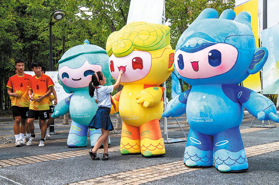 A girl plays with the mascots of the 19th Asian Games on Thursday in Yanweizhou Park, Jinhua, a co-host city of the event in Zhejiang province. HU XIAOFEI/FOR CHINA DAILY