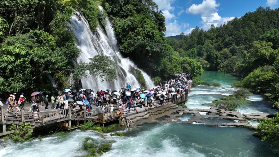 This aerial photo taken on Aug. 15, 2023, shows tourists visiting the Xiaoqikong scenic spot in Libo County, southwest China's Guizhou Province. (Xinhua/Yang Ying)