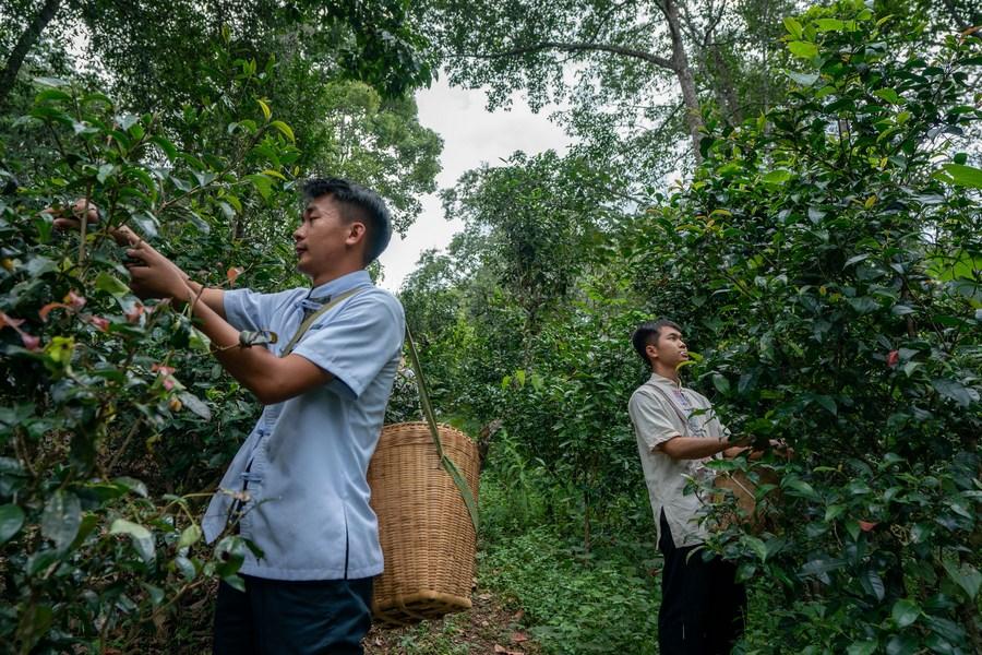 Farmers pick tea leaves at an old tea forest area of Jingmai Mountain in Pu'er, southwest China's Yunnan Province, Sept. 14, 2023. (Xinhua/Hu Chao)