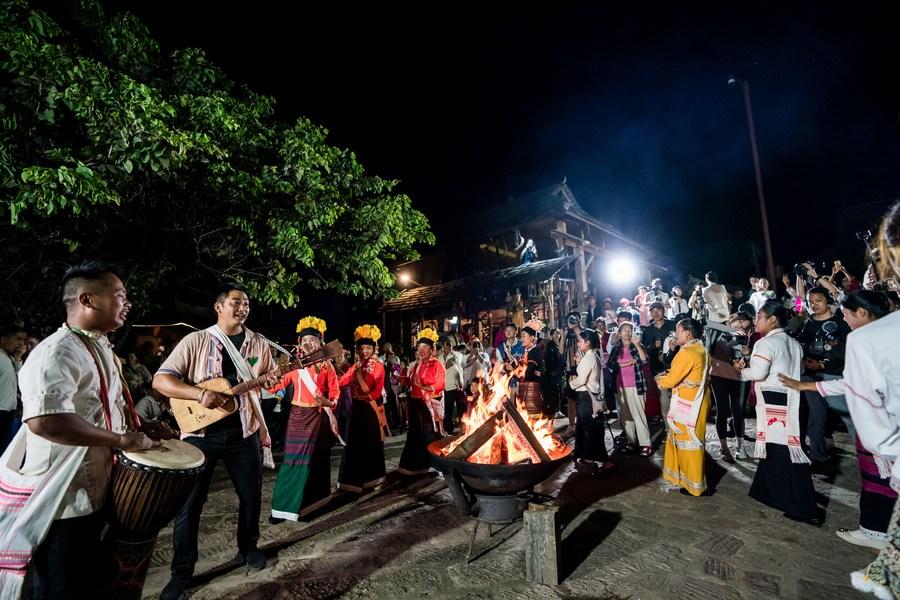 People dance in a traditional village in Jingmai Mountain of Pu'er City, southwest China's Yunnan Province, Sept. 17, 2023. (Xinhua/Hu Chao)