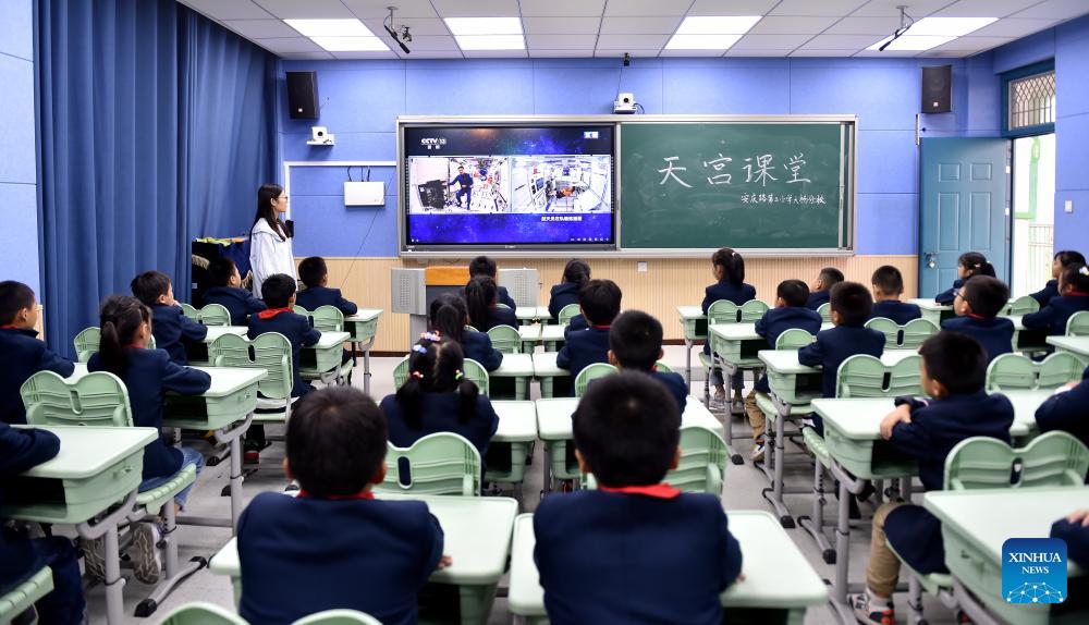 Students attend the fourth live class of the "Tiangong Class" series at a primary school in Hefei, east China's Anhui Province, Sept. 21, 2023. The fourth live class from China's space station was held on Thursday afternoon, delivered by the Shenzhou-16 astronauts Jing Haipeng, Zhu Yangzhu and Gui Haichao to students on Earth. (Photo by Ge Chuanhong/Xinhua)