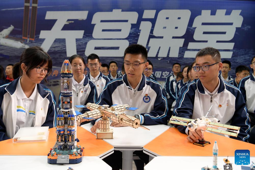Students learn about spacecraft models at the fourth live class of the "Tiangong Class" series in Yan'an Science and Technology Museum in Yan'an, northwest China's Shaanxi Province, Sept. 21, 2023. The fourth live class from China's space station was held on Thursday afternoon, delivered by the Shenzhou-16 astronauts Jing Haipeng, Zhu Yangzhu and Gui Haichao to students on Earth. (Photo by Deng Zhihong/Xinhua)