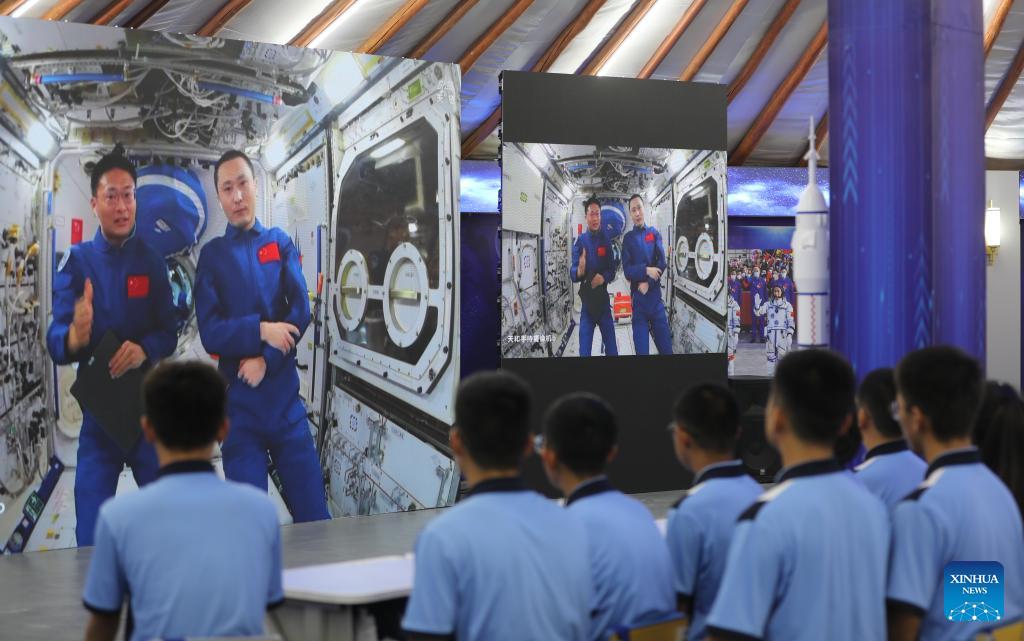 Students attend the fourth live class of the "Tiangong Class" series in Ejin Banner of Alxa League, north China's Inner Mongolia Autonomous Region, Sept. 21, 2023. The fourth live class from China's space station was held on Thursday afternoon, delivered by the Shenzhou-16 astronauts Jing Haipeng, Zhu Yangzhu and Gui Haichao to students on Earth. (Photo by Ao Qi/Xinhua)