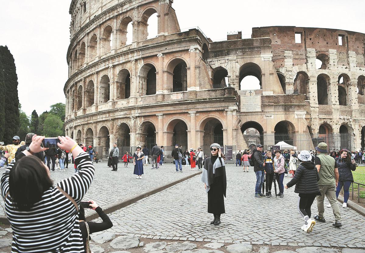 A Chinese tourist takes a photo in front of the Colosseum in Rome, on May 1. [PHOTO/XINHUA]