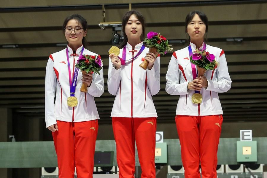 Gold medalists Han Jiayu, Huang Yuting and Wang Zhilin (L to R) pose during the award ceremony for the women's team 10m air rifle at the Hangzhou Asian Games on Sept. 24, 2023. (Xinhua/Zhu Zheng)