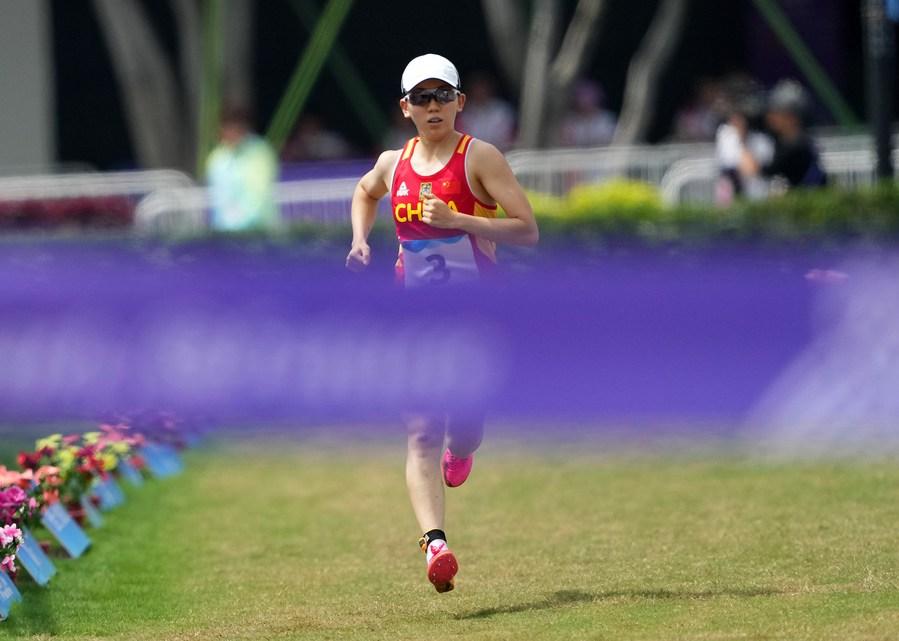 China's Zhang Mingyu competes in the women's individual laser-run of modern pentathlon at the Hangzhou Asian Games on Sept. 24, 2023. (Xinhua/Wan Xiang)