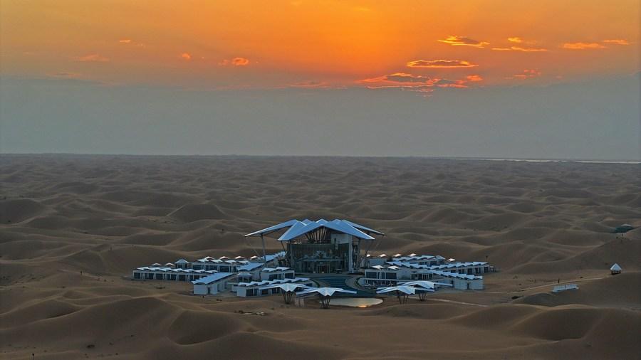 This aerial photo taken on Sept. 6, 2023 shows the Desert Star Hotel in Shapotou District of Zhongwei City, northwest China's Ningxia Hui Autonomous Region. (Xinhua/Wang Peng)