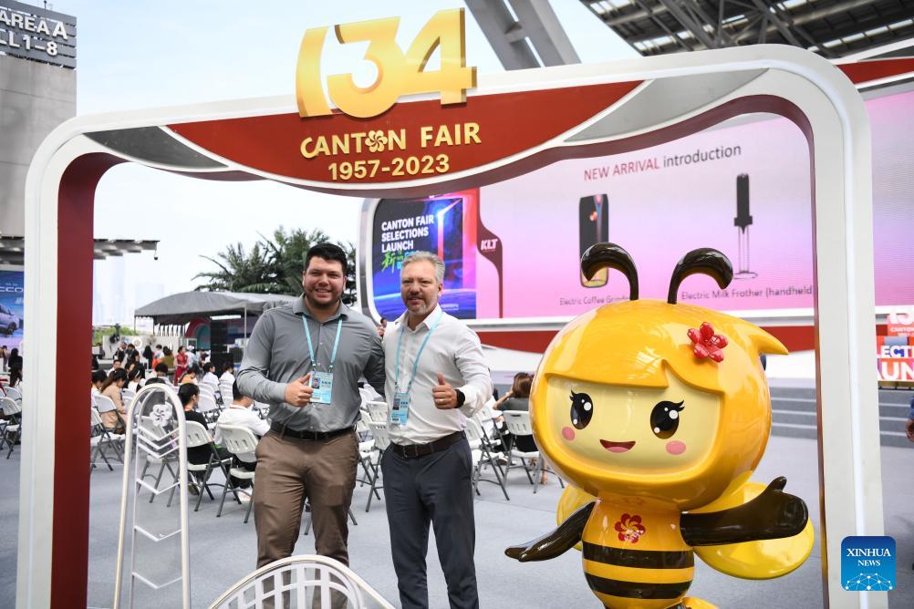 Brazilian buyers pose for photos at the 134th session of the China Import and Export Fair in Guangzhou, south China's Guangdong Province, Oct. 15, 2023. (Xinhua/Deng Hua)