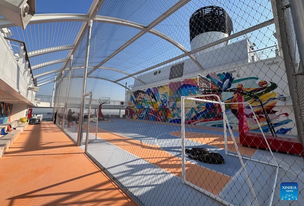 This photo taken on Dec. 24, 2023 shows a sports facility aboard the cruise ship "Adora Magic City" docked at the Shanghai Wusongkou International Cruise Terminal in east China's Shanghai. China's first domestically-built large cruise ship, the "Adora Magic City," departed from a port in Shanghai on Sunday, starting its trial operation. (Xinhua/Ding Ting)