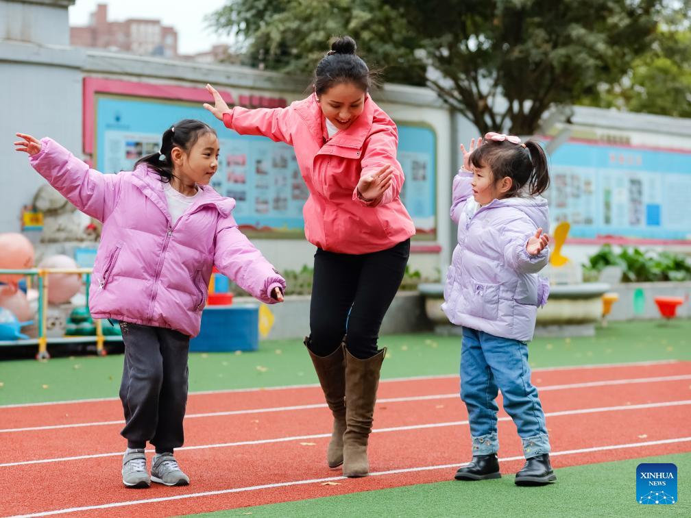 Yanggyi teaches Guozhuang dance to kids at a kindergarten in Chengdu, southwest China's Sichuan Province, Dec. 15, 2023. (Xinhua/Shen Bohan)