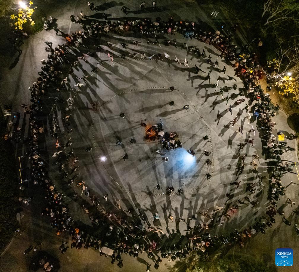 This aerial photo taken on Dec. 16, 2023 shows people dancing Guozhuang at a square in Chengdu, southwest China's Sichuan Province. (Xinhua/Shen Bohan)