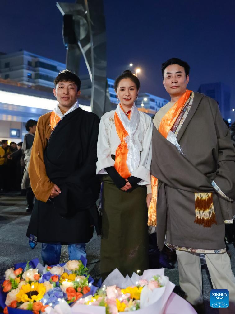 Yanggyi (C) and her teammates pose for photos at a square in Chengdu, southwest China's Sichuan Province, Dec. 23, 2023. (Xinhua/Shen Bohan)