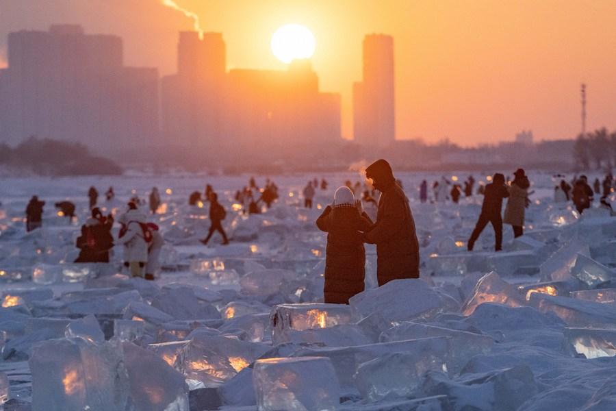 Tourists are seen at an ice amusement spot at sunset on the Songhuajiang River Harbin section in Harbin, northeast China's Heilongjiang Province, Jan. 7, 2024. (Xinhua/Xie Jianfei)