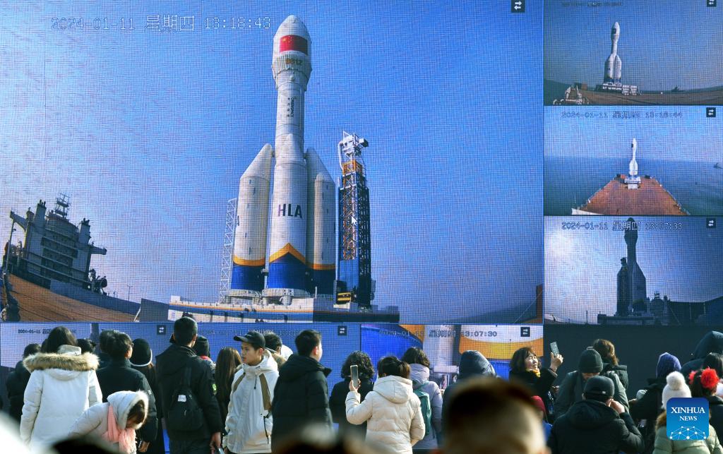 People gather in front of a screen to watch the launch of a Gravity-1 (YL-1) commercial carrier rocket carrying three satellites, on the Lianli Island of Haiyang, east China's Shandong Province, Jan. 11, 2024. China on Thursday sent a sea-launched Gravity-1 (YL-1) carrier rocket into space, sending three satellites into the planned orbit. (Xinhua/Li Ziheng)