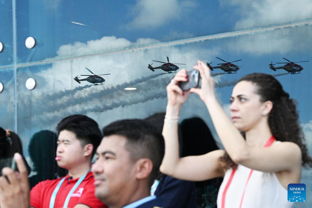 Helicopters of aerobatic team Sarang of Indian Air Force perform during the aerial display of the Singapore Airshow held in Singapore's Changi Exhibition Centre on Feb. 20, 2024. The airshow kicked off on Tuesday and will last until Feb. 25. It is attended by over 1,000 participating companies and is expected to attract 50,000 trade attendees from over 50 countries and regions. (Photo by Then Chih Wey/Xinhua)