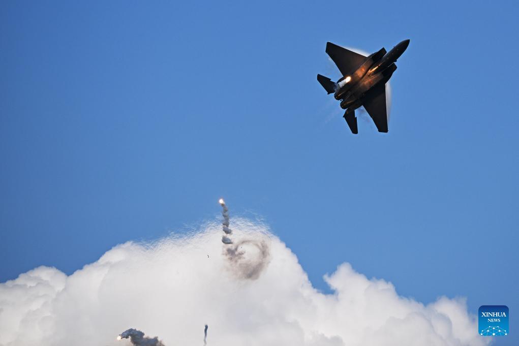 A F-15SG fighter aircraft of Republic of Singapore Air Force performs during the aerial display of the Singapore Airshow held in Singapore's Changi Exhibition Centre on Feb. 20, 2024. The airshow kicked off on Tuesday and will last until Feb. 25. It is attended by over 1,000 participating companies and is expected to attract 50,000 trade attendees from over 50 countries and regions. (Photo by Then Chih Wey/Xinhua)