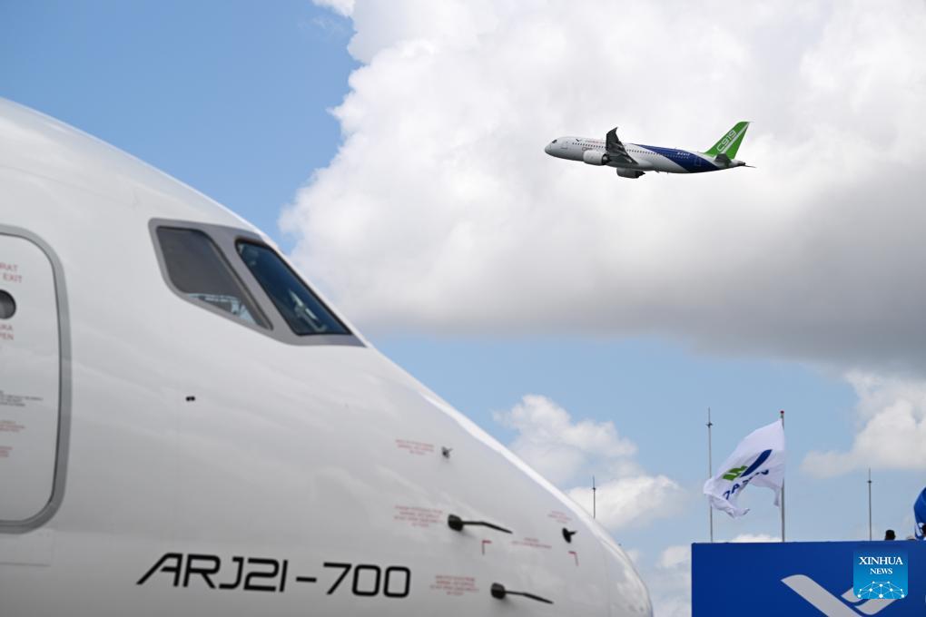 A Chinese passenger jet C919 performs at the Singapore Airshow in Singapore, Feb. 20, 2024. Chinese passenger jet C919 debuted in a flight demonstration at the Singapore Airshow, which kicked off on Tuesday. Two C919 narrow-body aircraft and three ARJ21 jetliners developed by the Commercial Aircraft Corporation of China, Ltd (COMAC) attended the airshow. (Photo by Then Chih Wey/Xinhua)