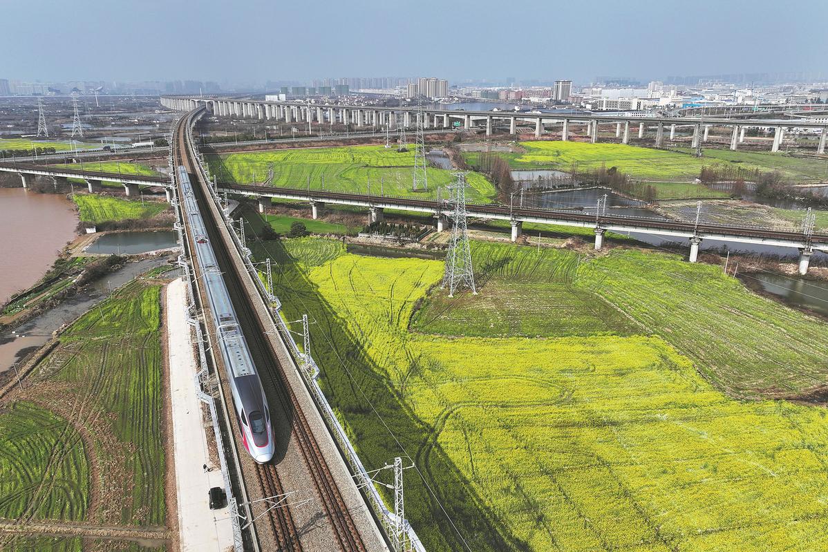 A high-speed train runs above a rape flower field in Nanchang county, Jiangxi province, on March 2. JIN LIANGKUAI/XINHUA