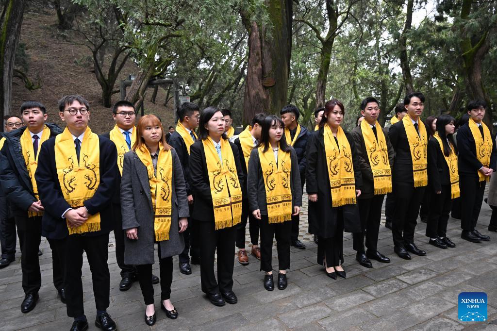 Members of a delegation of young people from Taiwan led by Ma Ying-jeou, former chairman of the Chinese Kuomintang party, visit the mausoleum of Huangdi, or the Yellow Emperor, in Huangling County, northwest China's Shaanxi Province, April 4, 2024. A ceremony was held here on Thursday to pay homage to Huangdi, who is considered to have been the founder of the Chinese civilization and the common ancestor of all Chinese people.