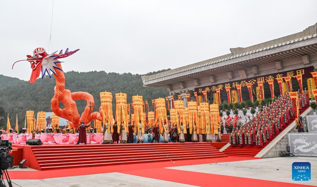A Chinese dragon-shaped installation is seen at a ceremony paying homage to Huangdi, or the Yellow Emperor, in Huangling County, northwest China's Shaanxi Province, April 4, 2024. More than 400 Chinese people, including overseas Chinese, attended a ceremony in northwest China's Shaanxi Province on Thursday to pay homage to Huangdi, who is considered to have been the founder of the Chinese civilization and the common ancestor of all Chinese people.