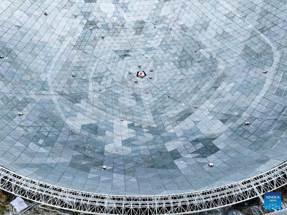 A drone photo taken on Feb. 27, 2024 shows part of the China's Five-hundred-meter Aperture Spherical Radio Telescope (FAST) under maintenance in southwest China's Guizhou Province. China's Five-hundred-meter Aperture Spherical Radio Telescope (FAST), the world's largest single-dish radio telescope, has identified more than 900 new pulsars since its launch in 2016, its operator said Wednesday. (Xinhua/Ou Dongqu)