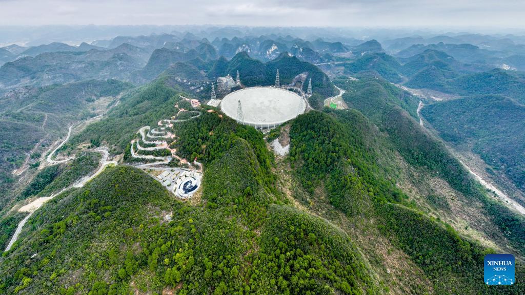 A drone panoramic photo taken on Feb. 26, 2024 shows China's Five-hundred-meter Aperture Spherical Radio Telescope (FAST) under maintenance in southwest China's Guizhou Province. China's Five-hundred-meter Aperture Spherical Radio Telescope (FAST), the world's largest single-dish radio telescope, has identified more than 900 new pulsars since its launch in 2016, its operator said Wednesday. (Xinhua/Ou Dongqu)