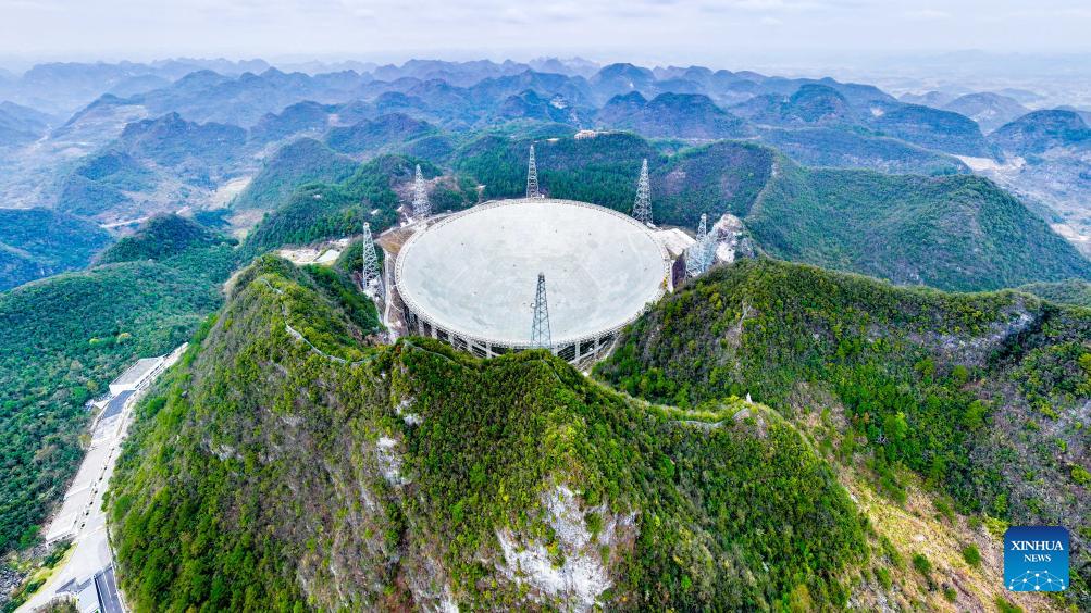 A drone photo taken on Feb. 27, 2024 shows China's Five-hundred-meter Aperture Spherical Radio Telescope (FAST) under maintenance in southwest China's Guizhou Province. China's Five-hundred-meter Aperture Spherical Radio Telescope (FAST), the world's largest single-dish radio telescope, has identified more than 900 new pulsars since its launch in 2016, its operator said Wednesday. (Xinhua/Ou Dongqu)