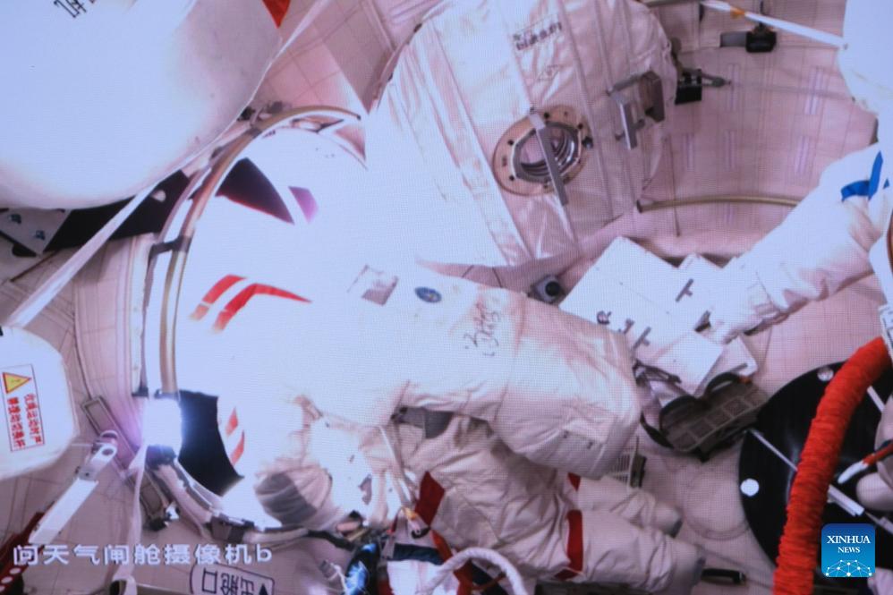 This screen image captured at Beijing Aerospace Control Center on May 28, 2024 shows Shenzhou-18 astronaut Ye Guangfu going out for extravehicular activities. The Shenzhou-18 crew members on board China's orbiting space station completed their first spacewalk on Tuesday, according to the China Manned Space Agency. (Xinhua/Li Jie)