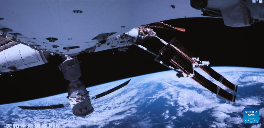 This screen image captured at Beijing Aerospace Control Center on May 28, 2024 shows Shenzhou-18 astronaut Ye Guangfu performing extravehicular activities. The Shenzhou-18 crew members on board China's orbiting space station completed their first spacewalk on Tuesday, according to the China Manned Space Agency. (Xinhua/Li Jie)