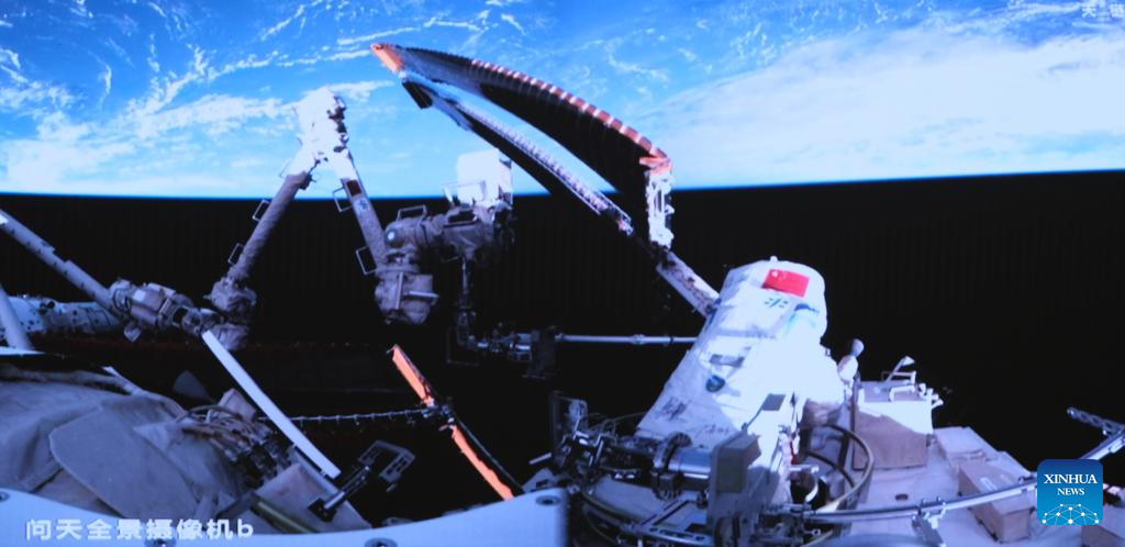 This screen image captured at Beijing Aerospace Control Center on May 28, 2024 shows Shenzhou-18 astronaut Li Guangsu returning to space station after extravehicular activities. The Shenzhou-18 crew members on board China's orbiting space station completed their first spacewalk on Tuesday, according to the China Manned Space Agency. (Xinhua/Li Jie)
