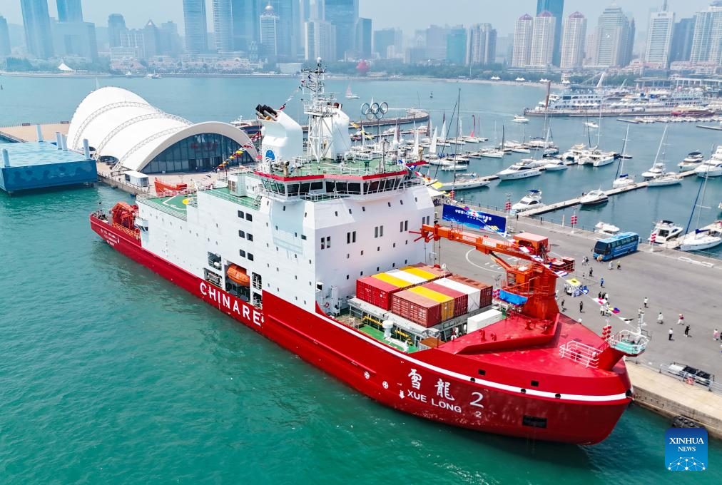 An aerial drone photo taken on July 3, 2024 shows China's icebreaker Xuelong 2 berthing at the pier of Qingdao Olympic Sailing Center in Qingdao, east China's Shandong Province. China's icebreaker Xuelong 2 and icebreaker research vessel Jidi were open to public here on Wednesday. This is also the first time for Jidi, China's independently designed and built icebreaker research vessel, to allow for public visit since its official delivery on June 24 this year.(Photo by Zhang Jingang/Xinhua)