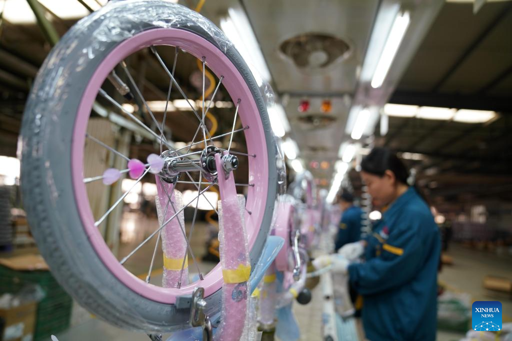 Workers are busy at the production line of children's bicycles in Pingxiang County, north China's Hebei Province, Oct. 24, 2024.(Xinhua/Mu Yu)