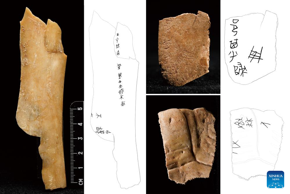 This undated file combo photo shows oracle bones with inscriptions unearthed from the Zhouyuan site in Baoji City, northwest China's Shaanxi Province and their copies. Six significant archaeological sites in China were named the top new discoveries in 2024, announced Wednesday at an annual forum hosted by the Chinese Academy of Social Sciences.