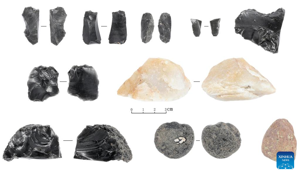 This undated file photo shows the stone artifacts unearthed from the Dadong paleolithic site in Helong City, northeast China's Jilin Province. Six significant archaeological sites in China were named the top new discoveries in 2024, announced Wednesday at an annual forum hosted by the Chinese Academy of Social Sciences.
