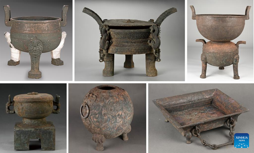 This undated file combo photo shows bronze wares unearthed from the Wuwangdun Tomb in Huainan City, east China's Anhui Province. Six significant archaeological sites in China were named the top new discoveries in 2024, announced Wednesday at an annual forum hosted by the Chinese Academy of Social Sciences.
