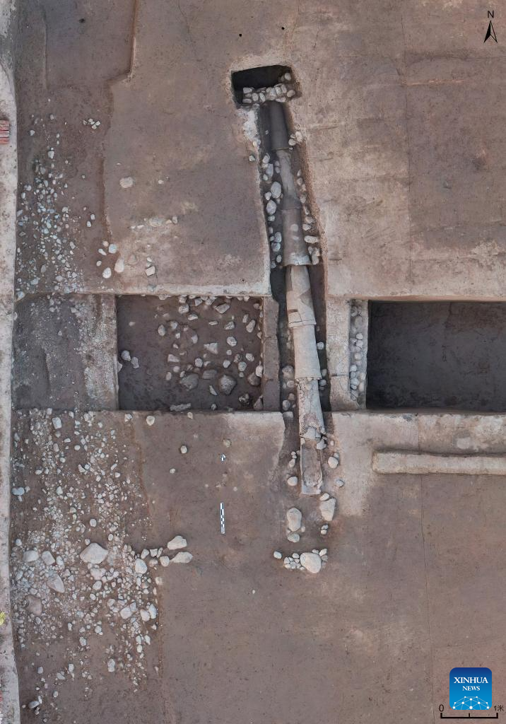 This undated file photo shows the relics of a road and a water pipe in the Zhouyuan site in Baoji City, northwest China's Shaanxi Province. Six significant archaeological sites in China were named the top new discoveries in 2024, announced Wednesday at an annual forum hosted by the Chinese Academy of Social Sciences.