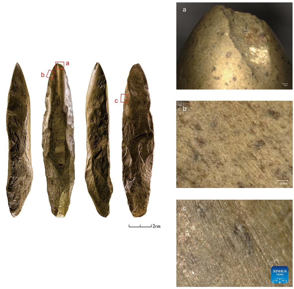 This undated file combo photo shows the stone artifacts (L) unearthed from the Dadong paleolithic site in Helong City, northeast China's Jilin Province and their details. Six significant archaeological sites in China were named the top new discoveries in 2024, announced Wednesday at an annual forum hosted by the Chinese Academy of Social Sciences.