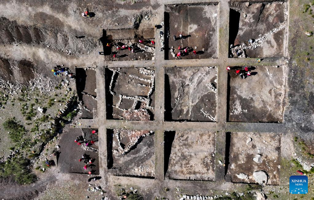 This aerial drone photo taken on Oct. 24, 2024 shows archaeologists conduct excavations at the Suyukou kiln in Helan Mountain in Yinchuan, capital of northwest China's Ningxia Hui Autonomous Region. Porcelain wares unearthed in northwest China's Ningxia Hui Autonomous Region, which were produced nearly 1,000 years ago during an ethnic minority-ruled dynasty, bear high resemblance to those made in the "porcelain capital" of Jingdezhen in east China.(Xinhua/Feng Kaihua)
