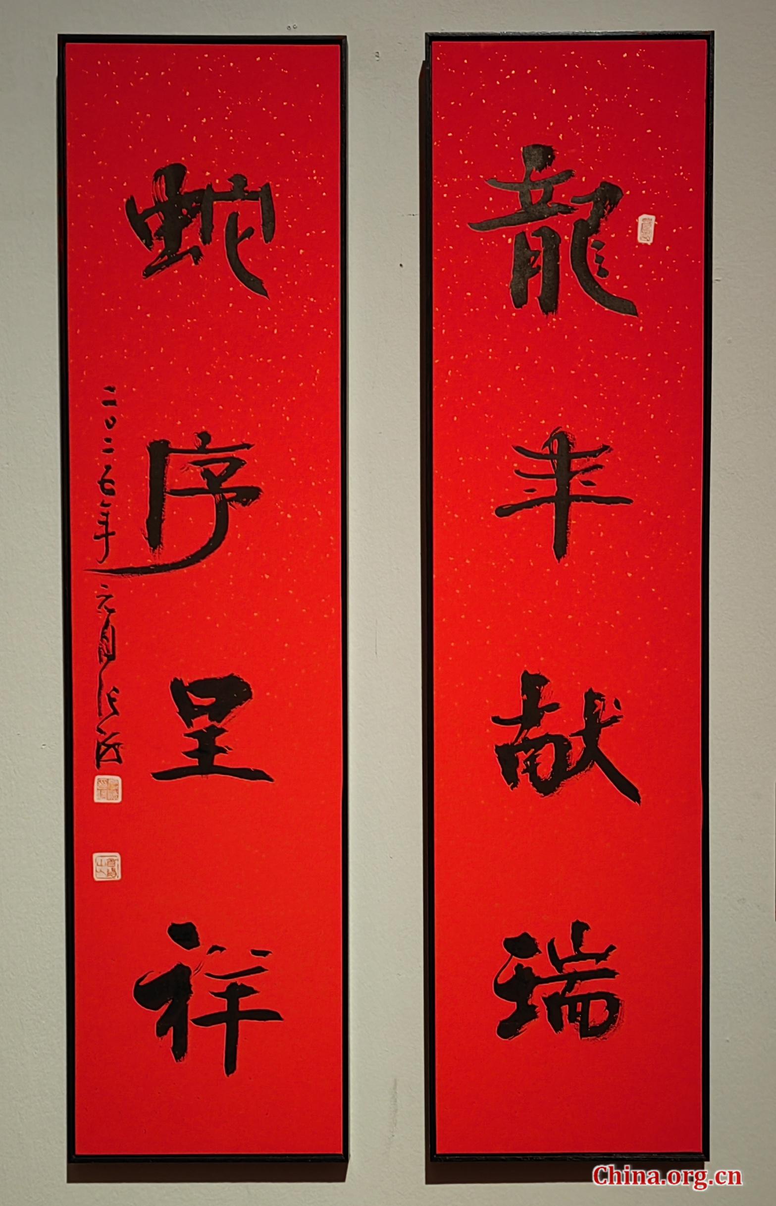 A couplet by Zhang Hai, titled "Auspicious Year of the Dragon; Prosperous Year of the Snake," is on display at the National Art Museum of China's "Auspicious Sign Greets the New Year" exhibition, Feb. 21, 2025. [Photo by Liu Sitong/China.org.cn]