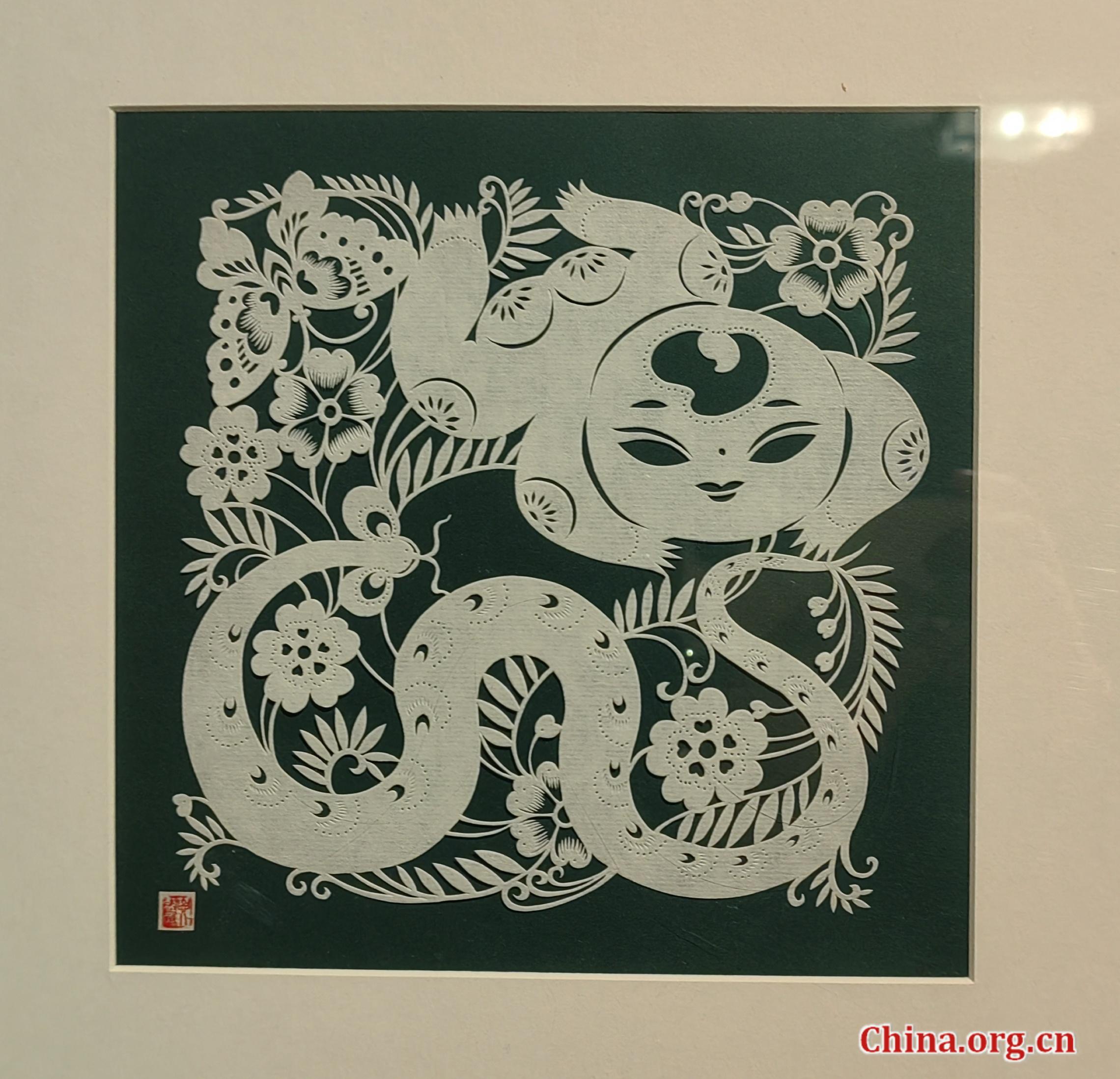 A paper cutting by Yao Hongxia featuring a snake playing with a child is on display at the National Art Museum of China's "Auspicious Sign Greets the New Year" exhibition, Feb. 21, 2025. [Photo by Liu Sitong/China.org.cn]