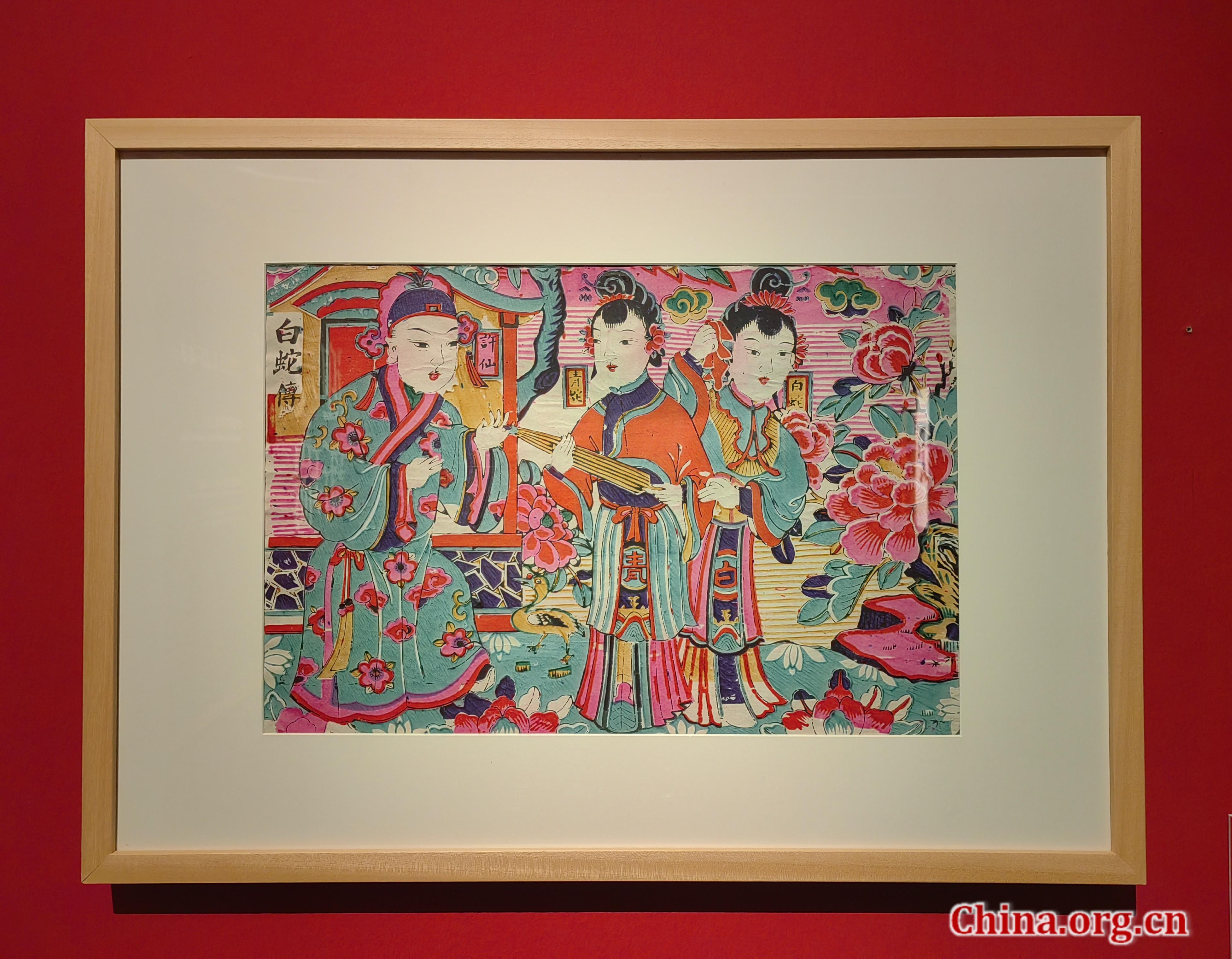 A traditional New Year's painting inspired by "The Legend of the White Snake" is on display at the National Art Museum of China's "Auspicious Sign Greets the New Year" exhibition, Feb. 21, 2025. [Photo by Liu Sitong/China.org.cn]