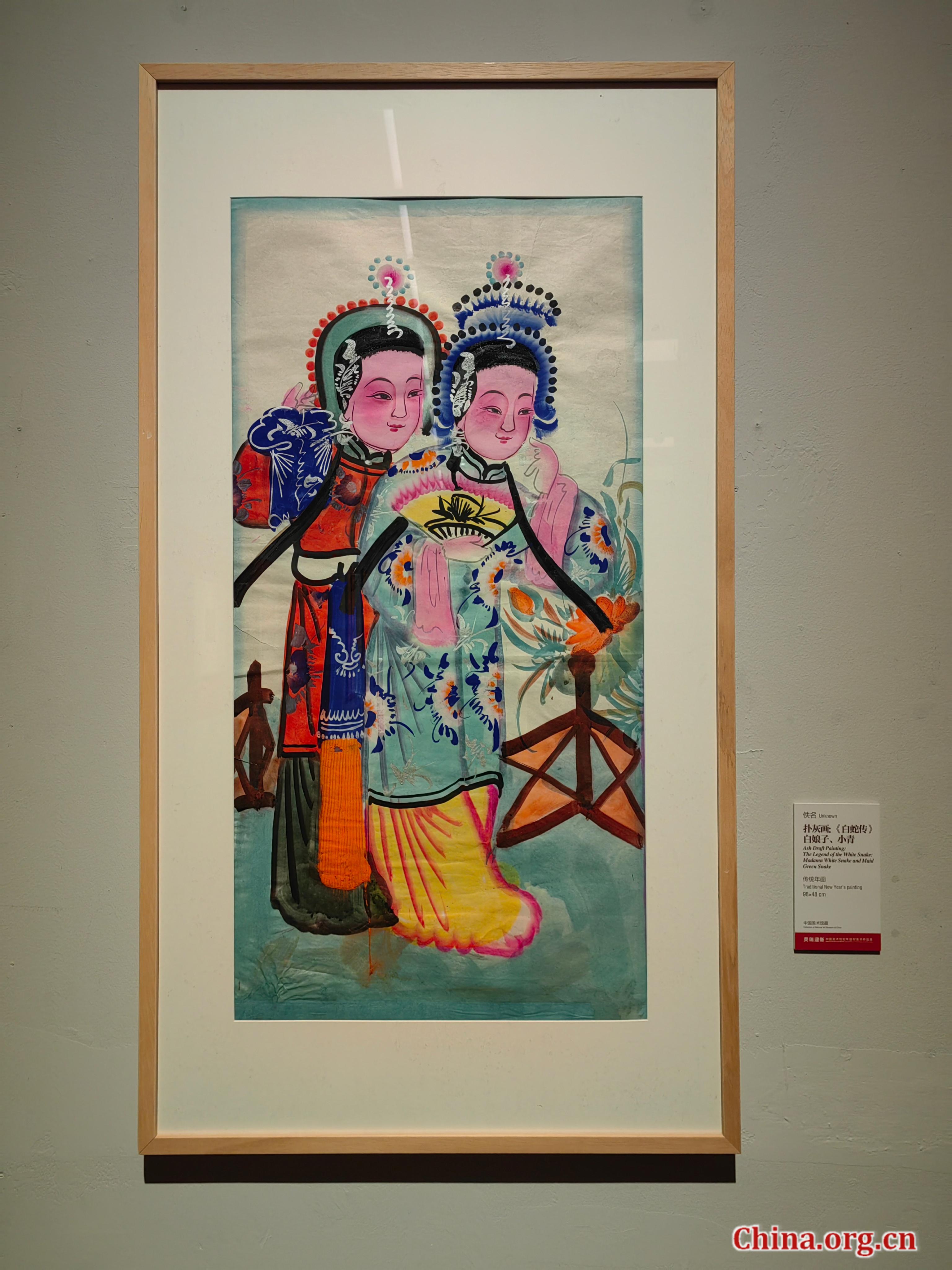 A New Year painting in the "flapping-ash" style, themed around "The Legend of the White Snake," is on display at the National Art Museum of China's "Auspicious Sign Greets the New Year" exhibition, Feb. 21, 2025. [Photo by Liu Sitong/China.org.cn]