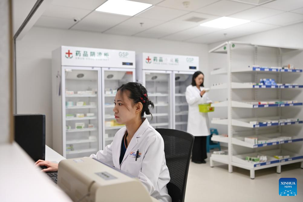 Medical workers are pictured at the outpatient pharmacy of the Perennial General Hospital Tianjin in Xiqing District of north China's Tianjin Municipality, Feb. 26, 2025. The Perennial General Hospital Tianjin, China's first wholly foreign-owned, tertiary general hospital, opened to public service here on Wednesday. (Xinhua/Li Ran)
