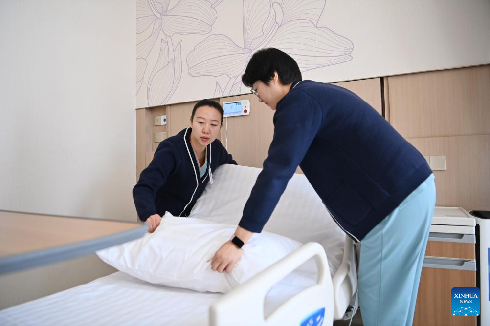 Nurses tidy up a bed at the Perennial General Hospital Tianjin in Xiqing District of north China's Tianjin Municipality, Feb. 26, 2025. The Perennial General Hospital Tianjin, China's first wholly foreign-owned, tertiary general hospital, opened to public service here on Wednesday. (Xinhua/Li Ran)