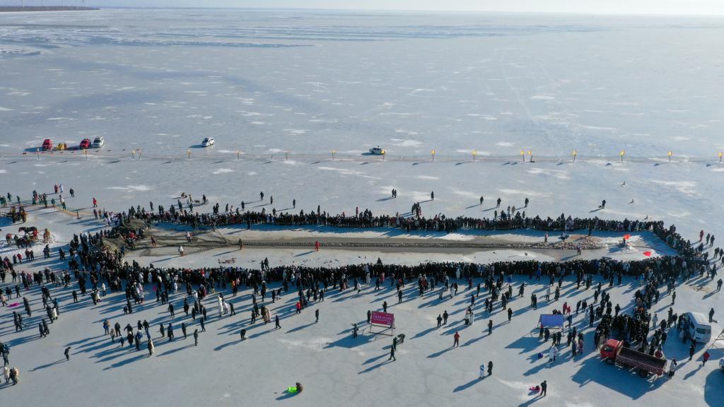 An aerial drone photo taken on Dec. 28, 2024 shows tourists watching winter fishing at Chagan Lake in Songyuan City of northeast China's Jilin Province. (Xinhua/Zhang Nan)