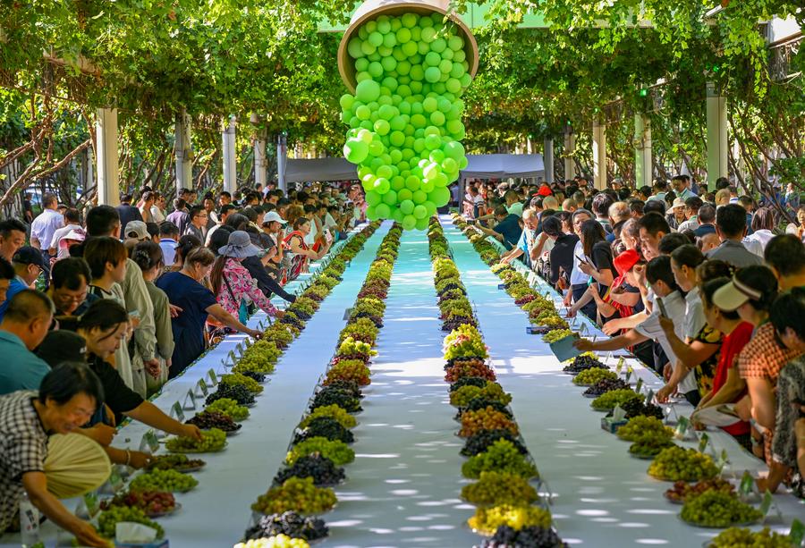 People taste grapes at a grape fair in Turpan, northwest China's Xinjiang Uygur Autonomous Region, Aug. 17, 2024. (Xinhua/Chen Shuo)