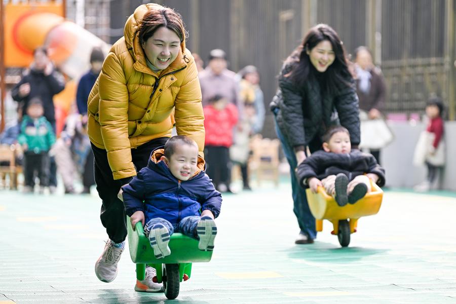 Women attend an event celebrating the International Women's Day with their children at a kindergarten in Nanjing, east China's Jiangsu Province, on March 7, 2025. (Photo by Fang Dongxu/Xinhua)