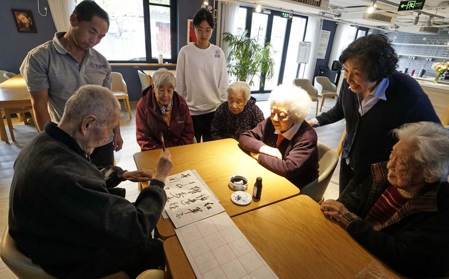 Senior residents learn calligraphy at an elderly care center in Dongcheng District in Beijing, capital of China, Oct. 31, 2024. (Xinhua/Li Xin)